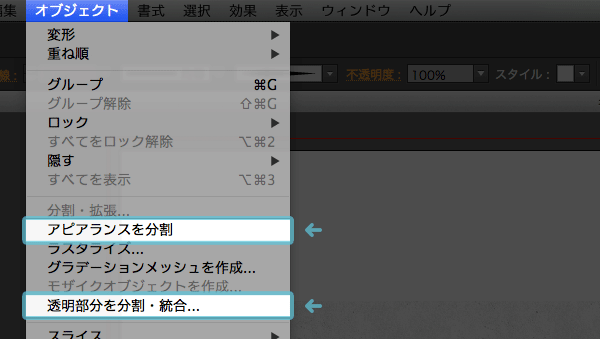 【2】「オブジェクト」>「アピアランスを分割」または「透明部分を分割・統合」