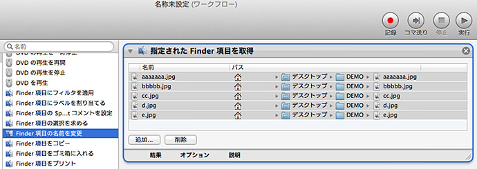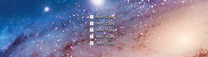 STEP6:以下実行結果です。本例ではリネーム後のファイルをデスクトップに保存しましたが、【Finder項目コピー】の部分で保存場所が指定できます。本例ではたった5ファイルのリネームですが、100ファイル,200ファイルのリネームも可能です。そういった際には本領を発揮しますね。