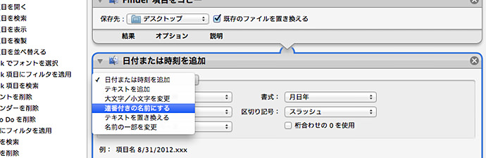STEP3:左側の項目から実行したい自動操作を選択します。ここでは【Finder項目の名前を変更】を選択します。