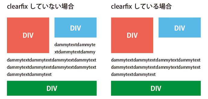 使い方はfloatの外殻にあたるdivに対してclass=”clearfix”を記述します。