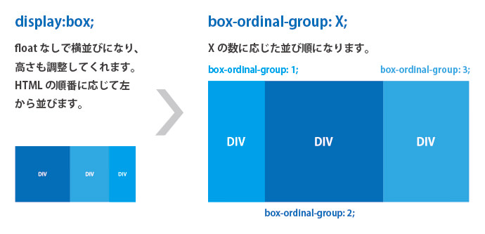 横並びにした小要素の順番を指定できます。これまでHTMLの順番にそって右からなり左からなり順序は決まっていましたが、これを用いると任意で順序の入れ替えが可能になります。