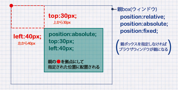 「static」以外は「top」「bottom」「left」「right」のプロパティが使えるようになり、親ボックスからの上下左右の距離をとった位置指定が出来ます。