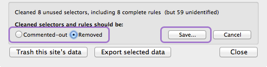 不要セレクタを洗い出したら削除かコメントアウトかの選択を行います。画像では削除を選択しています。あとはsaveをクリックすることでcssファイルがダウンロードできます。