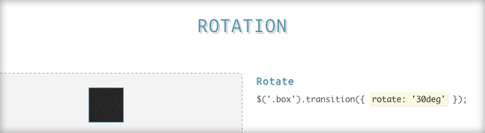 $(‘.box’).transition({ rotate: ’30deg’ });