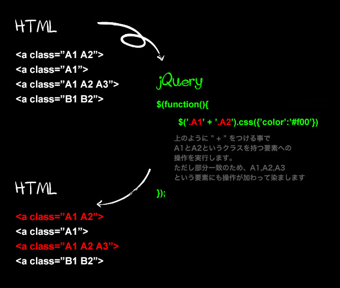 実装方法は非常にシンプルですjQueryの要素設定で”+”でつなぐだけです。概要は下の画像をご参照ください。下の例ではクラスA1とクラスA2を持つ要素を対象にしています。画像にも書いてあるように部分一致ですのでA1,A2,A3というクラスを持っていた要素も操作対象に含まれます。
