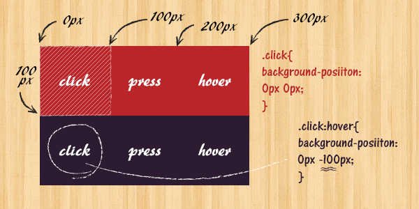 <a id="sprites" href=""></a>2.次に、上で書いたHTML(aタグ)に対して背景画像を位置左上で指定します。